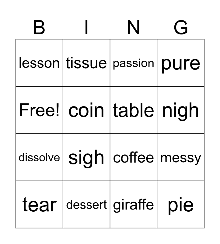 This bingo card has 16 words: dessert, messy, passion, lesson, dissolve, tissue, coffee, giraffe, Free!, coin, tear, pure, sigh, nigh, table and pie.
