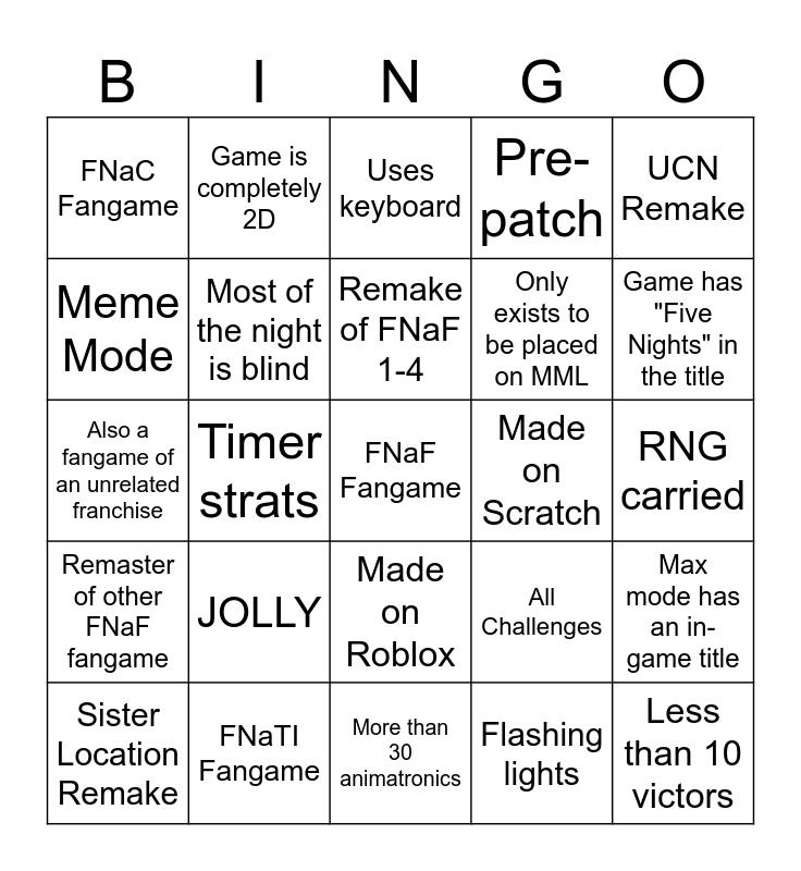 This bingo card has a free space and 24 words: JOLLY, FNaTI Fangame, Remake of FNaF 1-4, Sister Location Remake, UCN Remake, FNaC Fangame, Meme Mode, Game is completely 2D, Made on Scratch, Made on Roblox, Only exists to be placed on MML, Also a fangame of an unrelated franchise, All Challenges, Max mode has an in-game title, Most of the night is blind, Flashing lights, RNG carried, Uses keyboard, Game has "Five Nights" in the title, Timer strats, Less than 10 victors, Remaster of other FNaF fangame, Pre-patch and More than 30 animatronics.
