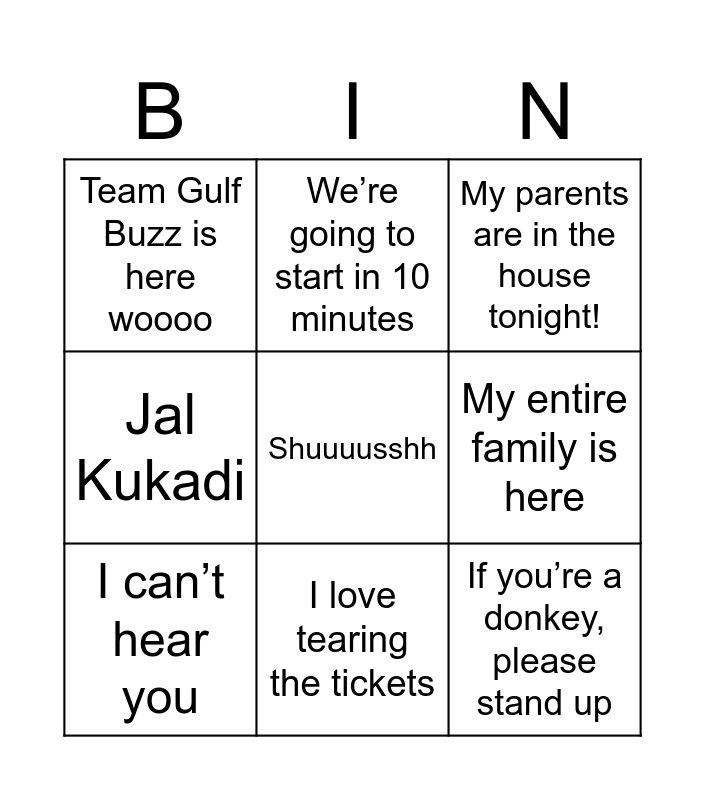 This bingo card has 26 words: Everyone’s favourite number 6 and 9, 69, I’m gonna shake shake shake shake, I love tearing the tickets, When I get a boogie ticket, I tear it, Shuuuusshh, Team Gulf Buzz is here woooo, My entire family is here, We’re going to start in 10 minutes, Say hello to the Syrian in the house!, How many donkeys in the house?, If you’re a donkey, please stand up, Heads, shoulders, knees, clap X 100, Please play ‘Aaj ki raat for KK’, Two Single Ladies, 11, Two fat ladies in the house, 88, Chameli, Jal Kukadi, Mummy maregi, My parents are in the house tonight!, Ketaki Ma’am, You have to dance, Sir, Ma'am, Are you ready to play Housie?, I can’t hear you and What sound does a donkey make?.