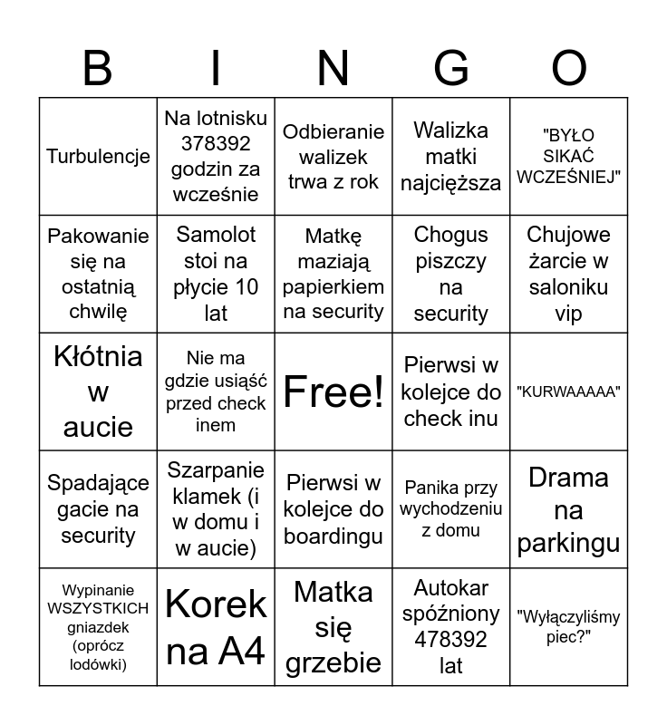 This bingo card has a free space and 24 words: Szarpanie klamek (i w domu i w aucie), Korek na A4, Matkę maziają papierkiem na security, Wypinanie WSZYSTKICH gniazdek (oprócz lodówki), "BYŁO SIKAĆ WCZEŚNIEJ", Turbulencje, Pakowanie się na ostatnią chwilę, Na lotnisku 378392 godzin za wcześnie, Pierwsi w kolejce do check inu, Pierwsi w kolejce do boardingu, Chogus piszczy na security, Kłótnia w aucie, Panika przy wychodzeniu z domu, Drama na parkingu, Samolot stoi na płycie 10 lat, Autokar spóźniony 478392 lat, "KURWAAAAA", Odbieranie walizek trwa z rok, Chujowe żarcie w saloniku vip, Nie ma gdzie usiąść przed check inem, "Wyłączyliśmy piec?", Spadające gacie na security, Walizka matki najcięższa and Matka się grzebie.