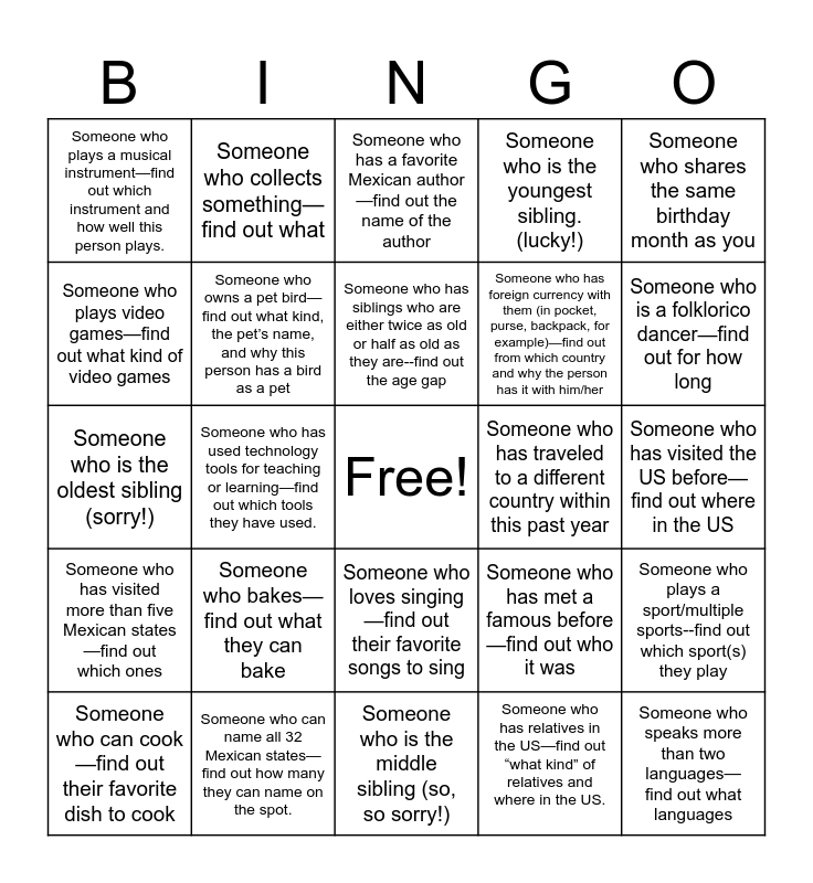 This bingo card has a free space and 24 words: Someone who bakes—find out what they can bake, Someone who can name all 32 Mexican states—find out how many they can name on the spot., Someone who has siblings who are either twice as old or half as old as they are--find out the age gap, Someone who can cook—find out their favorite dish to cook, Someone who shares the same birthday month as you, Someone who plays a musical instrument—find out which instrument and how well this person plays., Someone who plays video games—find out what kind of video games, Someone who collects something—find out what, Someone who has traveled to a different country within this past year, Someone who loves singing—find out their favorite songs to sing, Someone who has foreign currency with them (in pocket, purse, backpack, for example)—find out from which country and why the person has it with him/her, Someone who is the oldest sibling (sorry!), Someone who has met a famous before—find out who it was, Someone who plays a sport/multiple sports--find out which sport(s) they play, Someone who owns a pet bird—find out what kind, the pet’s name, and why this person has a bird as a pet, Someone who has relatives in the US—find out “what kind” of relatives and where in the US., Someone who has visited the US before—find out where in the US, Someone who has a favorite Mexican author—find out the name of the author, Someone who is a folklorico dancer—find out for how long, Someone who has used technology tools for teaching or learning—find out which tools they have used., Someone who speaks more than two languages—find out what languages, Someone who has visited more than five Mexican states—find out which ones, Someone who is the youngest sibling. (lucky!) and Someone who is the middle sibling (so, so sorry!).