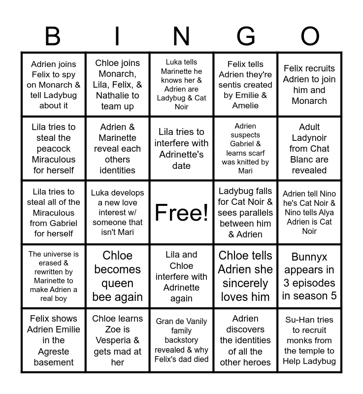 This bingo card has a free space and 24 words: Chloe becomes queen bee again, Chloe learns Zoe is Vesperia & gets mad at her, Lila tries to interfere with Adrinette's date, Felix shows Adrien Emilie in the Agreste basement, Felix recruits Adrien to join him and Monarch, Adrien joins Felix to spy on Monarch & tell Ladybug about it, Lila tries to steal the peacock Miraculous for herself, Chloe joins Monarch, Lila, Felix, & Nathalie to team up, Ladybug falls for Cat Noir & sees parallels between him & Adrien, Lila and Chloe interfere with Adrinette again, Adrien suspects Gabriel & learns scarf was knitted by Mari, Lila tries to steal all of the Miraculous from Gabriel for herself, Chloe tells Adrien she sincerely loves him, Bunnyx appears in 3 episodes in season 5, Adrien & Marinette reveal each others identities, Adrien discovers the identities of all the other heroes, Adrien tell Nino he's Cat Noir & Nino tells Alya Adrien is Cat Noir, Luka tells Marinette he knows her & Adrien are Ladybug & Cat Noir, Adult Ladynoir from Chat Blanc are revealed, Luka develops a new love interest w/ someone that isn't Mari, Su-Han tries to recruit monks from the temple to Help Ladybug, The universe is erased & rewritten by Marinette to make Adrien a real boy, Felix tells Adrien they're sentis created by Emilie & Amelie and Gran de Vanily family backstory revealed & why Felix's dad died.