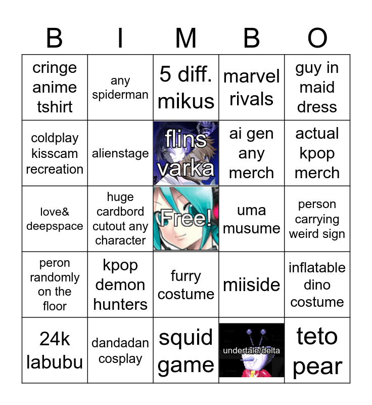 This bingo card has 2 images, a free space and 24 words: kpop demon hunters, dandadan cosplay, flins varka, 24k labubu, guy in maid dress, cringe anime tshirt, coldplay kisscam recreation, any spiderman, uma musume, furry costume, ai gen any merch, love& deepspace, miiside, inflatable dino costume, alienstage, undertale/delta, person carrying weird sign, 5 diff. mikus, actual kpop merch, huge cardbord cutout any character, teto pear, peron randomly on the floor, marvel rivals and squid game.