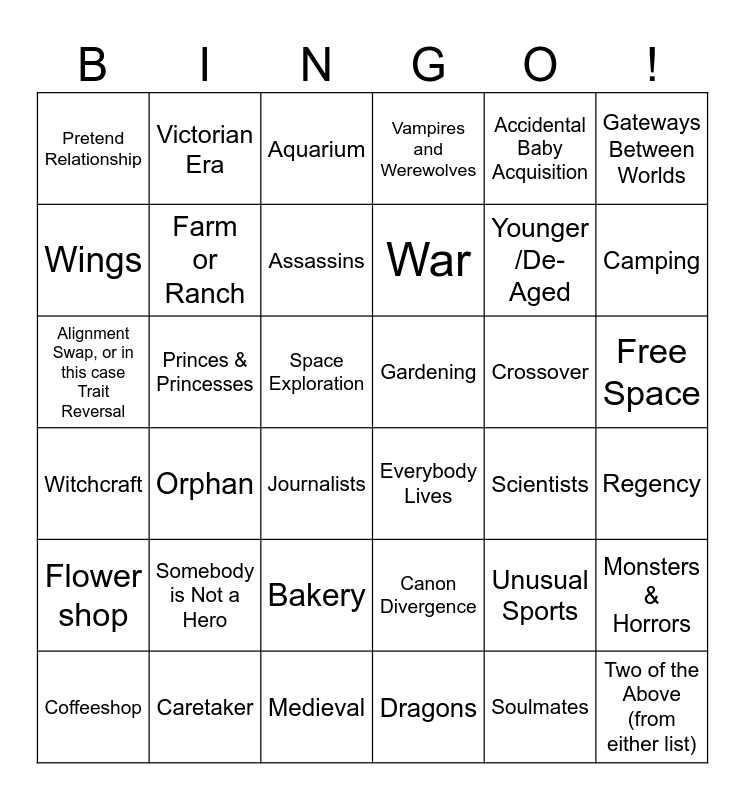 This bingo card has 36 words: Canon Divergence, Bakery, Dragons, Wings, Witchcraft, Gardening, Farm or Ranch, Medieval, Accidental Baby Acquisition, Unusual Sports, Camping, Vampires and Werewolves, Monsters & Horrors, Princes & Princesses, War, Pretend Relationship, Flower shop, Crossover, Alignment Swap, or in this case Trait Reversal, Aquarium, Space Exploration, Orphan, Everybody Lives, Journalists, Scientists, Victorian Era, Younger /De-Aged, Caretaker, Assassins, Gateways Between Worlds, Two of the Above (from either list), Coffeeshop, Regency, Free Space, Somebody is Not a Hero and Soulmates.