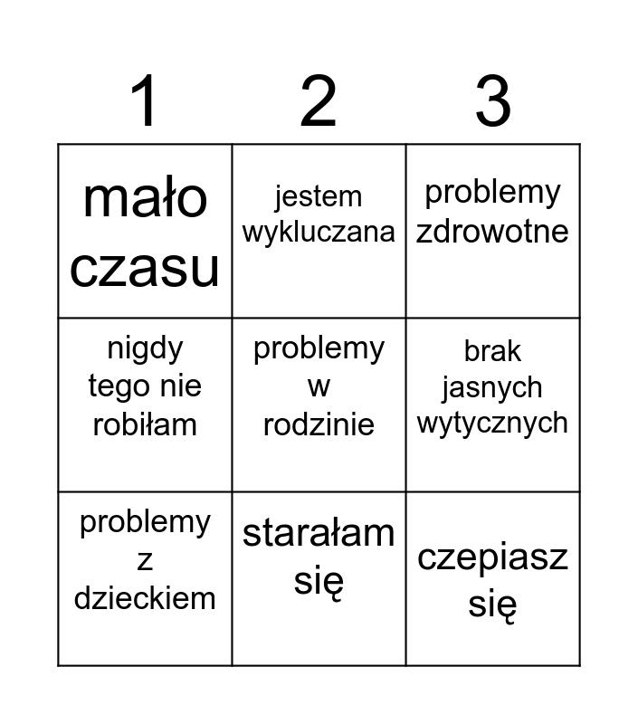 This bingo card has 9 words: problemy z dzieckiem, problemy w rodzinie, problemy zdrowotne, mało czasu, jestem wykluczana, brak jasnych wytycznych, nigdy tego nie robiłam, starałam się and czepiasz się.
