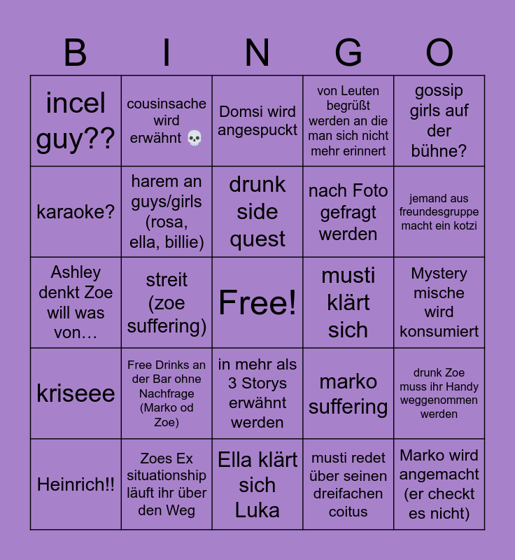 This bingo card has a free space and 24 words: Free Drinks an der Bar ohne Nachfrage (Marko od Zoe), Zoes Ex situationship läuft ihr über den Weg, drunk side quest, Heinrich!!, gossip girls auf der bühne?, incel guy??, karaoke?, cousinsache wird erwähnt 💀, musti klärt sich, in mehr als 3 Storys erwähnt werden, nach Foto gefragt werden, Ashley denkt Zoe will was von…, marko suffering, drunk Zoe muss ihr Handy weggenommen werden, harem an guys/girls (rosa, ella, billie), musti redet über seinen dreifachen coitus, Mystery mische wird konsumiert, Domsi wird angespuckt, jemand aus freundesgruppe macht ein kotzi, streit (zoe suffering), Marko wird angemacht (er checkt es nicht), kriseee, von Leuten begrüßt werden an die man sich nicht mehr erinnert and Ella klärt sich Luka.
