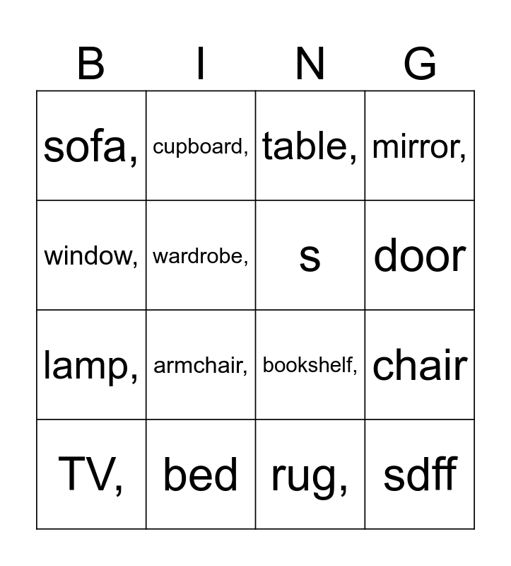 This bingo card has 16 words: bed, chair, table,, sofa,, lamp,, cupboard,, bookshelf,, rug,, window,, wardrobe,, TV,, mirror,, armchair,, door, s and sdff.