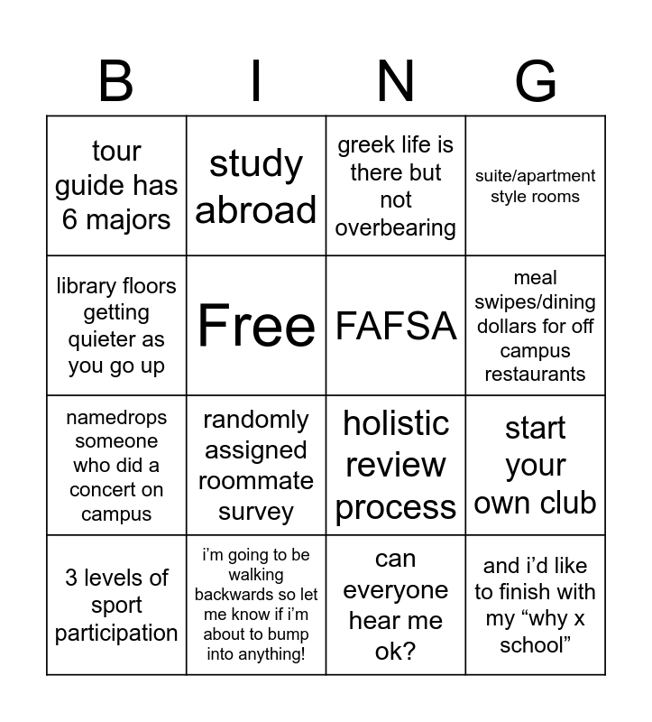 This bingo card has 16 words: i’m going to be walking backwards so let me know if i’m about to bump into anything!, start your own club, greek life is there but not overbearing, tour guide has 6 majors, namedrops someone who did a concert on campus, study abroad, holistic review process, can everyone hear me ok?, library floors getting quieter as you go up, Free, 3 levels of sport participation, suite/apartment style rooms, randomly assigned roommate survey, meal swipes/dining dollars for off campus restaurants, FAFSA and and i’d like to finish with my “why x school”.