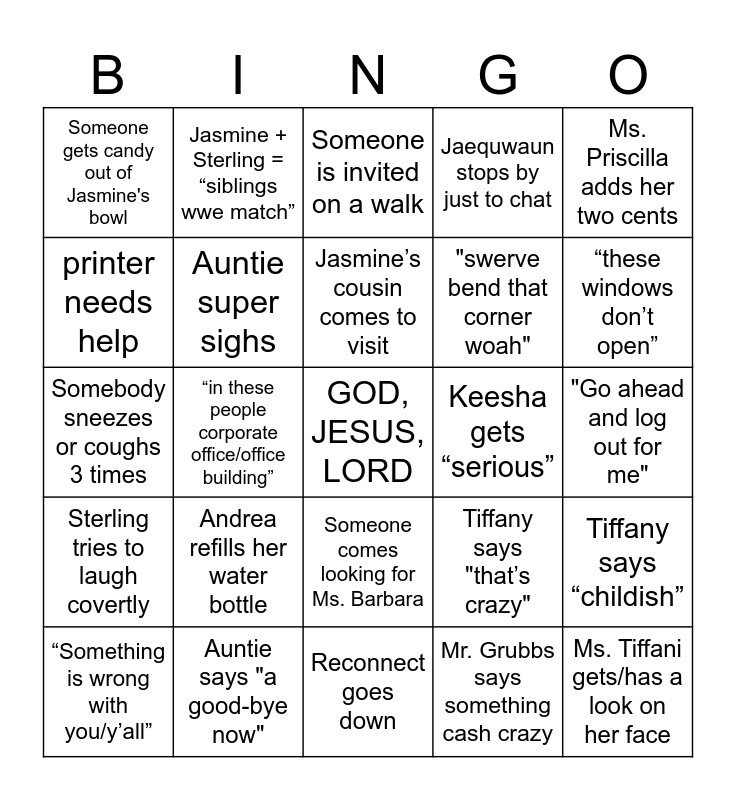 This bingo card has a free space and 34 words: “Go sit down”, Mr. Grubbs says something cash crazy, Andrea says “anyways / anywho”, Taylor gets pulled into the shenanigans, Sterling tries to laugh covertly, Auntie super sighs, Ms. Priscilla adds her two cents, “Something is wrong with you/y’all”, Jasmine + Sterling = “siblings wwe match”, Ms. Netta “speeds” around that corner, Jasmine’s cousin comes to visit, Someone is invited on a walk, Someone gets banned or put on time-out, Auntie starts singing hymns, Keesha gets “serious”, “these windows don’t open”, Auntie says "a good-bye now", Somebody sneezes or coughs 3 times, Andrea refills her water bottle, Tiffany says "that’s crazy", Someone comes looking for Ms. Barbara, "ma'am", Someone gets candy out of Jasmine's bowl, "Go ahead and log out for me", Reconnect goes down, Ms. Tiffani gets/has a look on her face, Jaequwaun stops by just to chat, Corey moseys over, "swerve bend that corner woah", printer needs help, “I’m finna call them people/folks”, “in these people corporate office/office building”, Tiffany says “childish” and name we can’t pronounce.