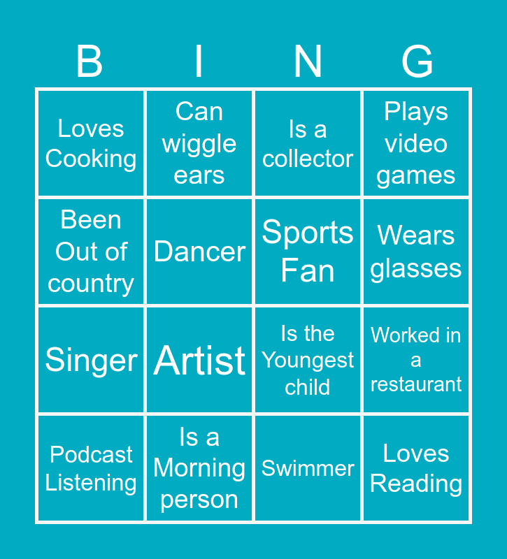 This bingo card has 32 words: Play a Musical instrument, Worked in Retail, Worked in a restaurant, Film Buff, Loves Reading, Sports Fan, Been Out of country, Is an Only Child, Can wiggle ears, is ambidextrous, Wears glasses, Is a collector, Can quote a TV show, Has Been on TV, Is a Morning person, Is a night person, Never Flown on and airplane, Is the Youngest child, Is the Oldest Child, Is Left-Handed, Crafting, Bing Watching, Swimmer, Pet Owner, Podcast Listening, Plays video games, Singer, Dancer, Loves Cooking, Does not cook, Biker and Artist.
