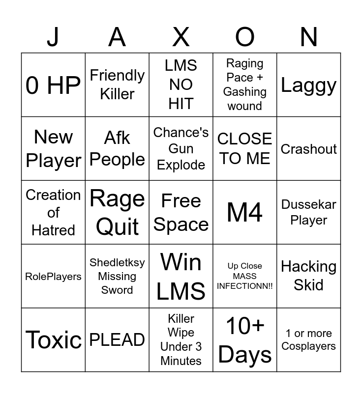 This bingo card has a free space and 24 words: Shedletksy Missing Sword, PLEAD, Chance's Gun Explode, Toxic, Laggy, 0 HP, New Player, Friendly Killer, M4, Win LMS, CLOSE TO ME, Creation of Hatred, Up Close MASS INFECTIONN!!, Hacking Skid, Afk People, 10+ Days, Dussekar Player, LMS NO HIT, Crashout, Rage Quit, 1 or more Cosplayers, RolePlayers, Raging Pace + Gashing wound and Killer Wipe Under 3 Minutes.