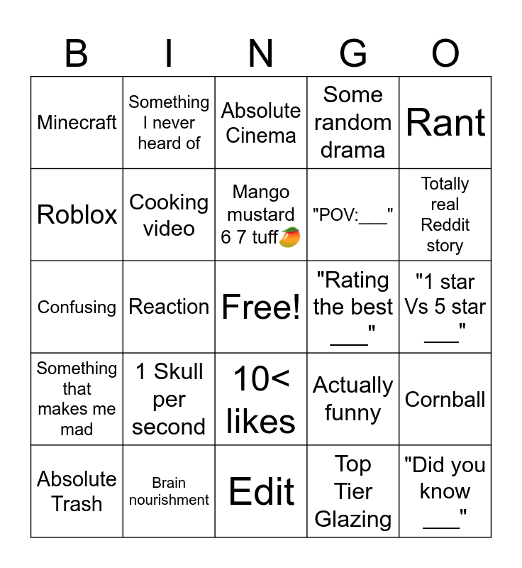 This bingo card has a free space and 25 words: 1 Skull per second, Edit, Mango mustard 6 7 tuff🥭, Absolute Trash, Rant, Minecraft, Roblox, Something I never heard of, "Rating the best ___", 10< likes, "POV:___", Confusing, Actually funny, Cornball, Cooking video, experiments, "1 star Vs 5 star ___", Absolute Cinema, Totally real Reddit story, Reaction, "Did you know ___", Brain nourishment, Something that makes me mad, Some random drama and Top Tier Glazing.