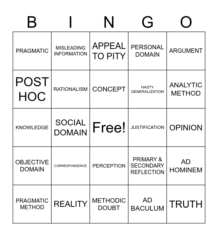 This bingo card has a free space and 40 words: EPISTEMOLOGY, KNOWLEDGE, EMPIRICISM, RATIONALISM, REALITY, PERCEPTION, CONCEPT, PROPOSITION, ARGUMENT, OBJECTIVE DOMAIN, SOCIAL DOMAIN, PERSONAL DOMAIN, TRUTH, OPINION, JUSTIFICATION, CORRESPONDENCE, COHERENCE, PRAGMATIC, FALLACIES, APPEAL TO PITY, AD HOMINEM, AD BACULUM, HASTY GENERALIZATION, POST HOC, AD POPULUM, FALSE ANALOGY, FALLACY OF COMPOSITION, FALLACY OF DIVISION, DICTO SIMPLICITER, PETITIO PRINCIPII, DIALECTIC METHOD, PRAGMATIC METHOD, PHENOMENOLOGICAL METHOD, PRIMARY & SECONDARY REFLECTION, ANALYTIC METHOD, METHODIC DOUBT, MISINFORMATION, DISINFORMATION, MISLEADING INFORMATION and OUT OF CONTEXT INFORMATION.