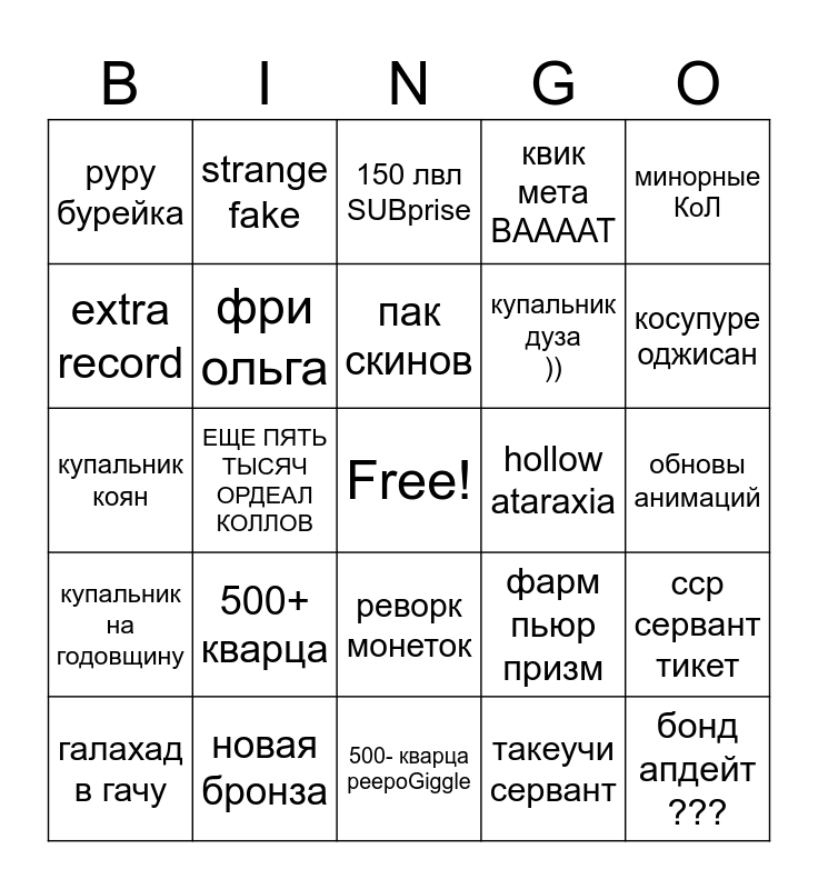 This bingo card has a free space and 24 words: 500+ кварца, новая бронза, пак скинов, галахад в гачу, минорные КоЛ, руру бурейка, extra record, strange fake, hollow ataraxia, реворк монеток, купальник дуза )), купальник коян, фарм пьюр призм, сср сервант тикет, фри ольга, такеучи сервант, обновы анимаций, 150 лвл SUBprise, косупуре оджисан, ЕЩЕ ПЯТЬ ТЫСЯЧ ОРДЕАЛ КОЛЛОВ, бонд апдейт ???, купальник на годовщину, квик мета BAAAAT and 500- кварца peepoGiggle.