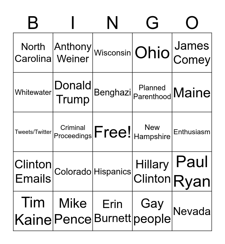 This bingo card has a free space and 36 words: John King, Electoral College, Anderson Cooper, Donald Trump, Hillary Clinton, Clinton Emails, Benghazi, Tax Returns, James Comey, Investigation, Criminal Proceedings, Ohio, Michigan, New Hampshire, Maine, North Carolina, Florida, Colorado, Nevada, Wisconsin, Enthusiasm, Paul Ryan, Mike Pence, Tim Kaine, Erin Burnett, Anthony Weiner, Tweets/Twitter, NRA, Planned Parenthood, Whitewater, Bill Clinton, Ivanka Trump, Gay people, Hispanics, KKK and Ronald Reagan.
