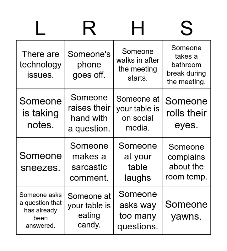 This bingo card has 16 words: Someone at your table is eating candy., Someone complains about the room temp., Someone walks in after the meeting starts., There are technology issues., Someone sneezes., Someone's phone goes off., Someone at your table laughs, Someone asks way too many questions., Someone is taking notes., Someone raises their hand with a question., Someone asks a question that has already been answered., Someone takes a bathroom break during the meeting., Someone makes a sarcastic comment., Someone rolls their eyes., Someone at your table is on social media. and Someone yawns..
