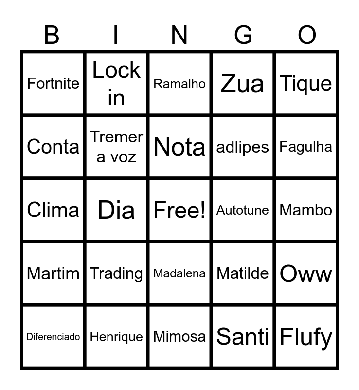 This bingo card has a free space and 45 words: Banger, Flufy, Weslley, Diferenciado, crack na voz, Santi, Ramalho, Skate, Tique, Henrique, Zua, Autotune, Madalena, Trading, Estarreja, Mimosa, Dubai, Clima, GG, Fagulha, Lock in, Grind, Miguel, Fortnite, Chilar, Mambo, Rico, Bárbara, Matilde, Martim, Sigma, Oww, Aqui, Gemer, Gritar, Dia, Baddie, Carro, Alto, Nota, Conta, adlipes, Falar baixo, Tremer a voz and Cantar Rápido.