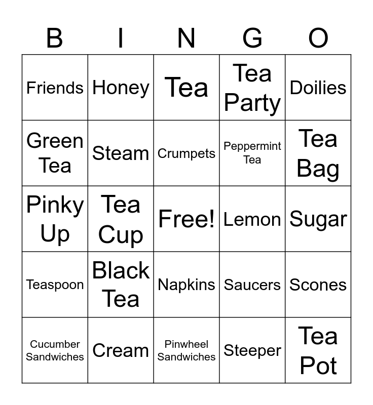 This bingo card has a free space and 24 words: Black Tea, Cream, Crumpets, Cucumber Sandwiches, Doilies, Friends, Green Tea, Honey, Lemon, Napkins, Peppermint Tea, Pinky Up, Saucers, Scones, Steam, Steeper, Sugar, Tea, Tea Bag, Tea Cup, Tea Pot, Teaspoon, Tea Party and Pinwheel Sandwiches.