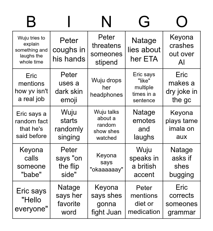 This bingo card has a free space and 24 words: Peter says "on the flip side", Natage says her favorite word, Wuju drops her headphones, Eric says "Hello everyone", Keyona crashes out over AI, Wuju tries to explain something and laughs the whole time, Eric mentions how yv isn't a real job, Peter coughs in his hands, Natage emotes and laughs, Keyona says "okaaaaaay", Eric says "like" multiple times in a sentence, Eric says a random fact that he's said before, Wuju speaks in a british accent, Natage asks if shes bugging, Peter uses a dark skin emoji, Peter mentions diet or medication, Keyona plays tame imala on aux, Peter threatens someones stipend, Eric makes a dry joke in the gc, Wuju starts randomly singing, Eric corrects someones grammar, Keyona calls someone "babe", Natage lies about her ETA and Keyona says shes gonna fight Juan.