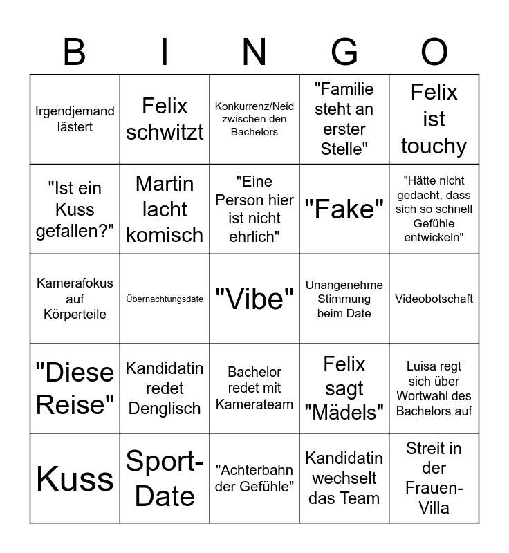 This bingo card has a free space and 24 words: Kandidatin redet Denglisch, Sport-Date, "Eine Person hier ist nicht ehrlich", Kuss, Felix ist touchy, Irgendjemand lästert, "Ist ein Kuss gefallen?", Felix schwitzt, Unangenehme Stimmung beim Date, Bachelor redet mit Kamerateam, "Fake", Kamerafokus auf Körperteile, Felix sagt "Mädels", Luisa regt sich über Wortwahl des Bachelors auf, Martin lacht komisch, Kandidatin wechselt das Team, Videobotschaft, Konkurrenz/Neid zwischen den Bachelors, "Hätte nicht gedacht, dass sich so schnell Gefühle entwickeln", Übernachtungsdate, Streit in der Frauen-Villa, "Diese Reise", "Familie steht an erster Stelle" and "Achterbahn der Gefühle".