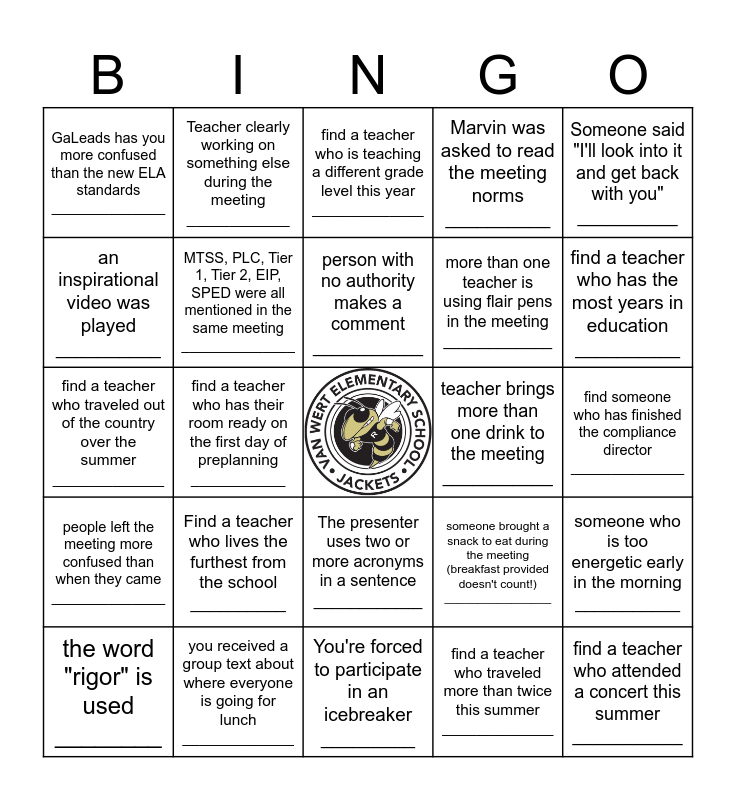 This bingo card has a free space and 24 words: Find a teacher who lives the furthest from the school __________, you received a group text about where everyone is going for lunch _____________, person with no authority makes a comment ___________, the word "rigor" is used ________, Someone said "I'll look into it and get back with you" __________, GaLeads has you more confused than the new ELA standards ______________, an inspirational video was played __________, Teacher clearly working on something else during the meeting ____________, teacher brings more than one drink to the meeting ___________, The presenter uses two or more acronyms in a sentence ____________, more than one teacher is using flair pens in the meeting ____________, find a teacher who traveled out of the country over the summer _____________, someone brought a snack to eat during the meeting (breakfast provided doesn't count!) ________________, someone who is too energetic early in the morning ___________, MTSS, PLC, Tier 1, Tier 2, EIP, SPED were all mentioned in the same meeting ______________, find a teacher who traveled more than twice this summer _____________, find someone who has finished the compliance director ______________, find a teacher who is teaching a different grade level this year _____________, find a teacher who has the most years in education __________, find a teacher who has their room ready on the first day of preplanning ___________, find a teacher who attended a concert this summer ___________, people left the meeting more confused than when they came ______________, Marvin was asked to read the meeting norms __________ and You're forced to participate in an icebreaker _________.