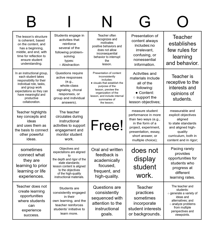 This bingo card has a free space and 24 words: Objectives and expectations are aligned to the depth and rigor of the state standards; lesson content is aligned to the objectives of the high-quality instructional materials., Students are consistently engaged in their own learning, and the teacher reinforces students’ initiative to learn more., Presentation of content inconsistently includes: ● visuals that establish the purpose of the lesson, preview the organization of the lesson, and include internal summaries of the lesson;, Teacher does not create learning opportunities where students can experience success., Teacher establishes few rules for learning and behavior., The lesson’s structure is coherent, based on the content, and has a beginning, middle, and end, with time for reflection to ensure student understanding., In an instructional group, each student takes responsibility for their individual role, tasks, and group work expectations so they can have meaningful and productive collaboration., Students engage in activities that reinforce several of the following problem-solving types: ○ Abstraction, measure student performance in more than two ways (e.g., in the form of a project, experiment, presentation, essay, short answer, or multiple choice);, Oral and written feedback is academically focused, frequent, and high-quality., Activities and materials include all of the following: ● Content: ○ support the lesson objectives;, Teacher highlights key concepts and ideas and uses them as the basis to connect other powerful ideas., does not display student work., Pacing rarely provides opportunities for students who progress at different learning rates., Questions require active responses (e.g., whole-class signaling, choral responses, or group and individual answers)., Teacher practices sometimes incorporate student interests or backgrounds., measurable and explicit objectives aligned to state standards and aligned high-quality curriculum, both in content and in rigor;, Teacher often recognizes and motivates positive behaviors and does not allow inconsequential behavior to interrupt the lesson., Teacher is receptive to the interests and opinions of students., The teacher circulates during instructional activities to support engagement and monitor student work., The teacher and students: ○ generate a variety of ideas and alternatives; and ○ analyze problems from multiple perspectives and viewpoints., sometimes connect what they are learning to prior learning or life experiences., Presentation of content always includes:no irrelevant, confusing, or nonessential information. and Questions are consistently sequenced with attention to the instructional goals..