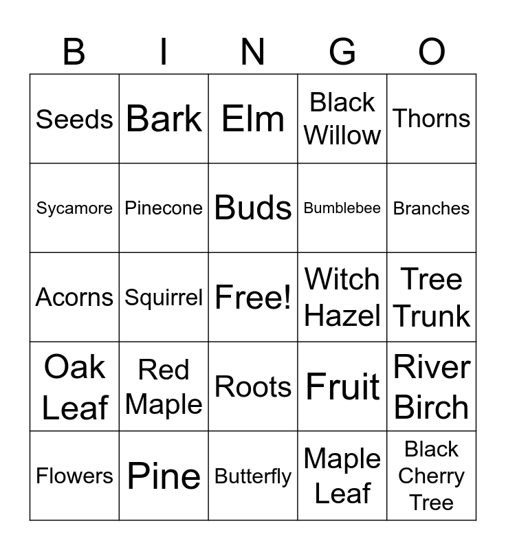 This bingo card has a free space and 24 words: Red Maple, Pine, Buds, Flowers, Thorns, Seeds, Sycamore, Bark, Witch Hazel, Roots, Bumblebee, Acorns, Fruit, River Birch, Pinecone, Maple Leaf, Tree Trunk, Elm, Branches, Squirrel, Black Cherry Tree, Oak Leaf, Black Willow and Butterfly.