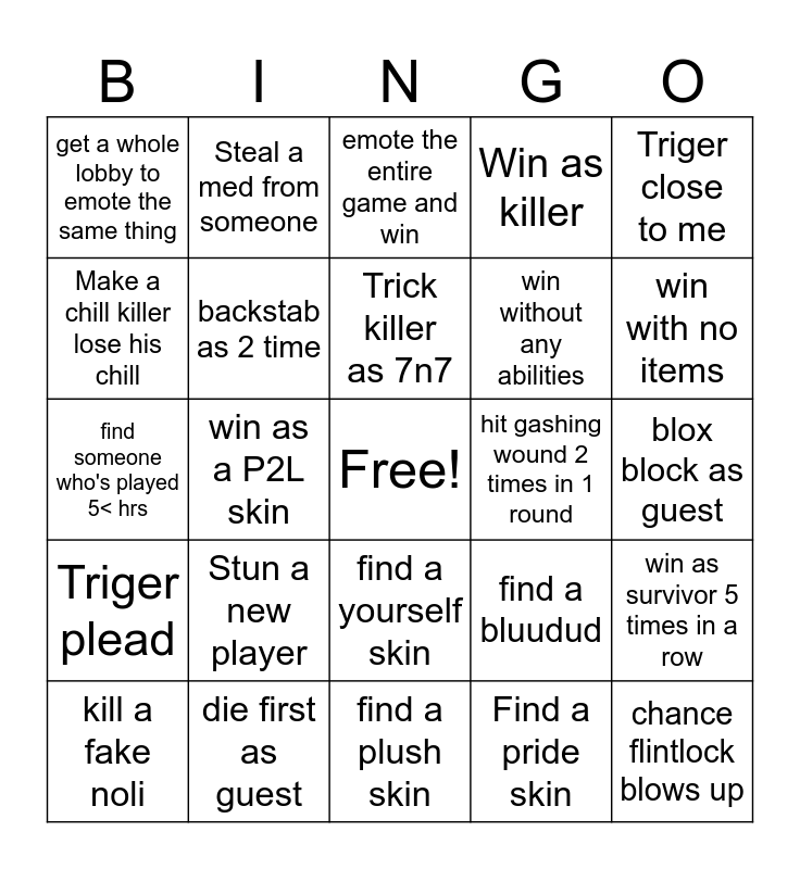 This bingo card has a free space and 24 words: Stun a new player, die first as guest, Trick killer as 7n7, kill a fake noli, Triger close to me, get a whole lobby to emote the same thing, Make a chill killer lose his chill, Steal a med from someone, hit gashing wound 2 times in 1 round, find a yourself skin, win without any abilities, find someone who's played 5< hrs, find a bluudud, win as survivor 5 times in a row, backstab as 2 time, Find a pride skin, blox block as guest, emote the entire game and win, win with no items, win as a P2L skin, chance flintlock blows up, Triger plead, Win as killer and find a plush skin.