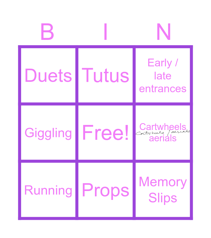 This bingo card has 1 images, a free space and 8 words: Cartwheels aerials, Early / late entrances, Tutus, Running, Duets, Memory Slips, Giggling and Props.