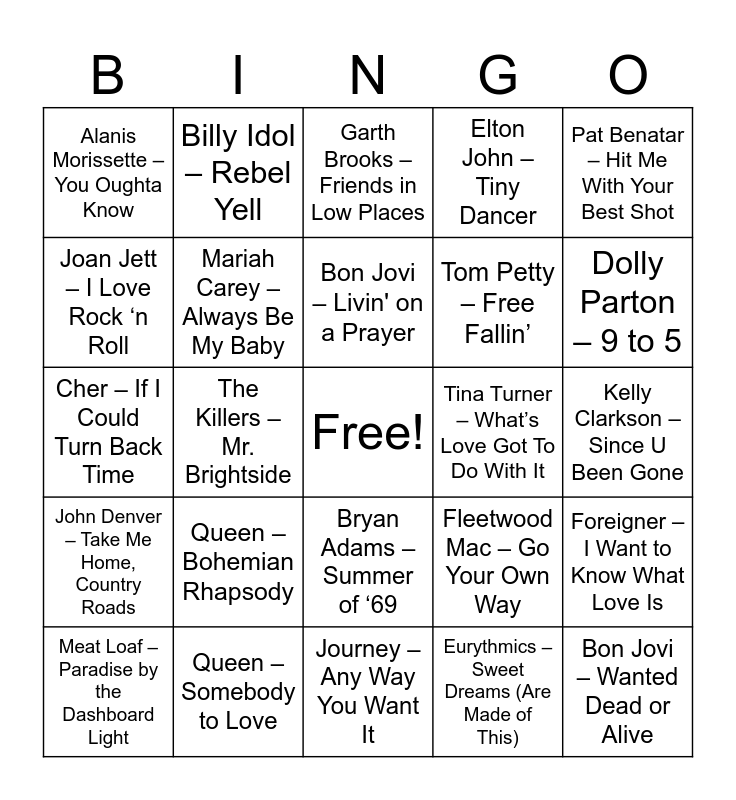 This bingo card has a free space and 25 words: Queen – Bohemian Rhapsody, Journey – Any Way You Want It, Bon Jovi – Livin' on a Prayer, Meat Loaf – Paradise by the Dashboard Light, Pat Benatar – Hit Me With Your Best Shot, Alanis Morissette – You Oughta Know, Joan Jett – I Love Rock ‘n Roll, Billy Idol – Rebel Yell, Tina Turner – What’s Love Got To Do With It, Bryan Adams – Summer of ‘69, Tom Petty – Free Fallin’, Cher – If I Could Turn Back Time, Fleetwood Mac – Go Your Own Way, Foreigner – I Want to Know What Love Is, Mariah Carey – Always Be My Baby, Adele – Rolling in the Deep, Kelly Clarkson – Since U Been Gone, Garth Brooks – Friends in Low Places, Dolly Parton – 9 to 5, The Killers – Mr. Brightside, Bon Jovi – Wanted Dead or Alive, Queen – Somebody to Love, John Denver – Take Me Home, Country Roads, Elton John – Tiny Dancer and Eurythmics – Sweet Dreams (Are Made of This).
