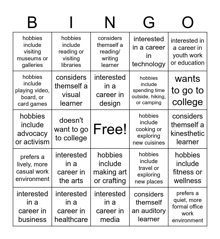 This bingo card has a free space and 24 words: interested in a career in the arts, interested in a career in healthcare, interested in a career in design, interested in a career in business, interested in a career in youth work or education, hobbies include visiting museums or galleries, hobbies include playing video, board, or card games, hobbies include reading or visiting libraries, hobbies include cooking or exploring new cuisines, hobbies include making art or crafting, hobbies include spending time outside, hiking, or camping, hobbies include advocacy or activism, hobbies include travel or exploring new places, hobbies include fitness or wellness, considers themself a visual learner, considers themself an auditory learner, considers themself a kinesthetic learner, considers themself a reading/ writing learner, wants to go to college, doesn't want to go to college, prefers a quiet, more formal office work environment, prefers a lively, more casual work environment, interested in a career in technology and interested in a career in media.