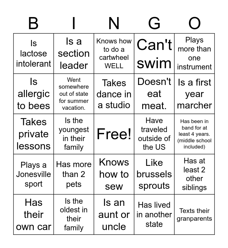 This bingo card has a free space and 24 words: Has more than 2 pets, Is the oldest in their family, Takes dance in a studio, Has their own car, Plays more than one instrument, Is lactose intolerant, Is allergic to bees, Is a section leader, Have traveled outside of the US, Knows how to sew, Doesn't eat meat., Takes private lessons, Like brussels sprouts, Has at least 2 other siblings, Went somewhere out of state for summer vacation., Has lived in another state, Has been in band for at least 4 years. (middle school included), Knows how to do a cartwheel WELL, Is a first year marcher, Is the youngest in their family, Texts their granparents, Plays a Jonesville sport, Can't swim and Is an aunt or uncle.