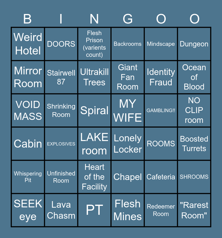This bingo card has 36 words: Chapel, Heart of the Facility, Flesh Mines, Mirror Room, Cabin, MY WIFE, Stairwell 87, PT, Mindscape, Cafeteria, Ocean of Blood, Backrooms, SHROOMS, Shrinking Room, Giant Fan Room, Weird Hotel, Whispering Pit, GAMBLING!!, VOID MASS, Flesh Prison (varients count), Spiral, EXPLOSIVES, Lonely Locker, LAKE room, ROOMS, DOORS, Identity Fraud, Lava Chasm, Ultrakill Trees, Dungeon, "Rarest Room", SEEK eye, Boosted Turrets, NO CLIP room, Unfinished Room and Redeemer Room.