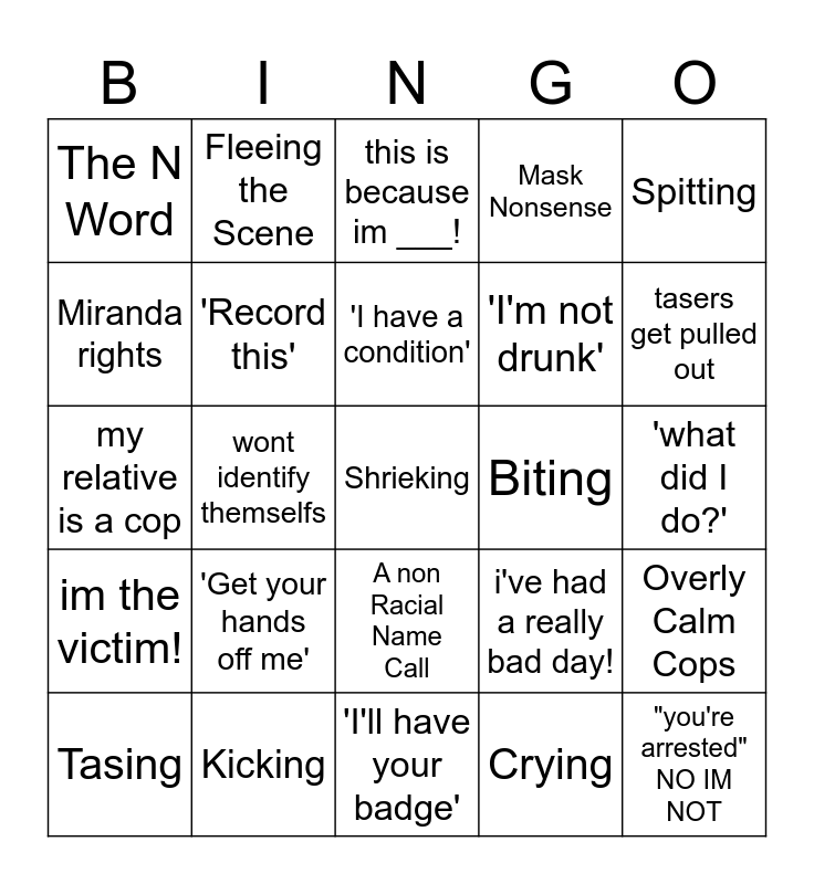 This bingo card has a free space and 54 words: ask for a manager, 'Get your hands off me', 'loosen my cuffs', refusing to get into cop car, 'what did I do?', 'I'm in a hurry/'I have somewhere to be', 'Record this', 'Why are you recording me?', Mask Nonsense, Vaccine Nonsense, The N Word, 'Do you know who I am?!', Crying, Overly Calm Cops, 'You're killing me!', 'You're kidding me!', 'I have a condition', 'I'm not drunk', Wants their purse/phone, Tasing, Kicking, 'I'll have your badge', Biting, Spitting, Blame the Cops, Fleeing the Scene, A non Racial Name Call, DUI, 'I know (so and so)', FREE MY GIRL, i have rights!, refuse field test, threatens cops, ask for badge ID/name, Miranda rights, my kids are at home, this is because im ___!, i've had a really bad day!, "you're arrested" NO IM NOT, my relative is a cop, arguing against video evidence, sovereign citizen, i pay your salary/you work for me, i know my rights, Help!!, refused to blow, stalling to blow, attempts to seduce cop, tasers get pulled out, im the victim!, wont identify themselfs, forced out of car, refusing/ stalling to get out and doesn't leave when they could leave.