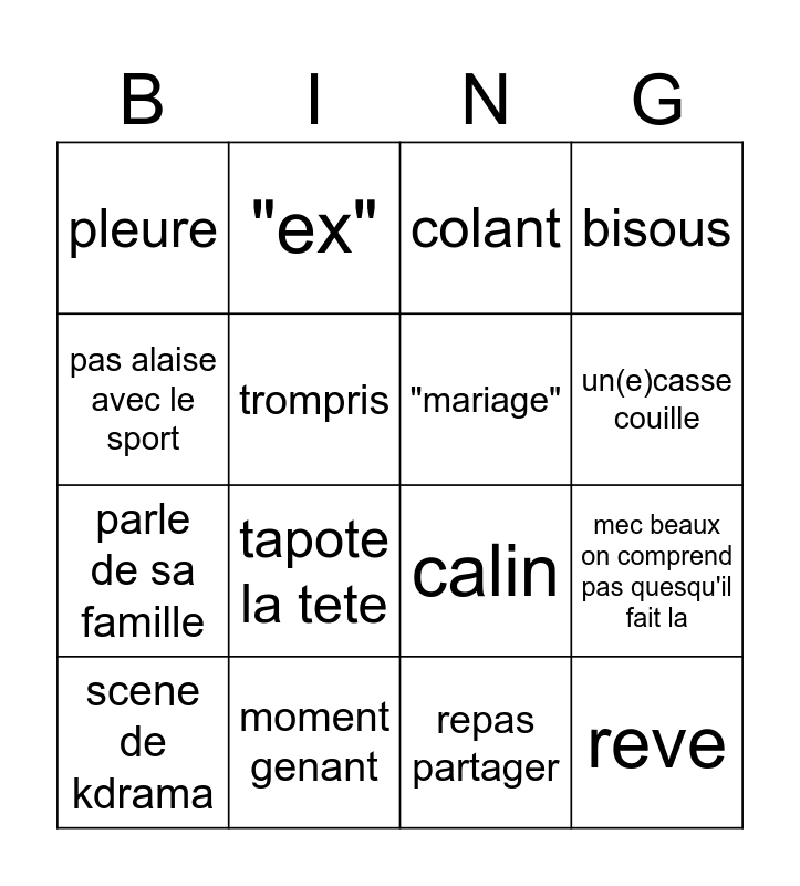 This bingo card has 16 words: moment genant, mec beaux on comprend pas quesqu'il fait la, colant, pleure, parle de sa famille, "ex", calin, repas partager, pas alaise avec le sport, trompris, scene de kdrama, bisous, tapote la tete, un(e)casse couille, "mariage" and reve.