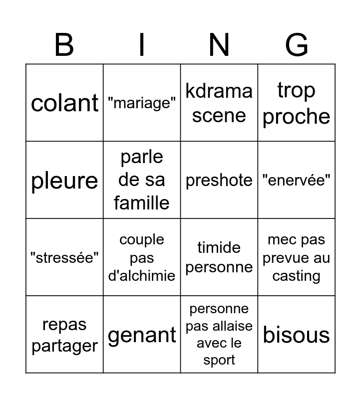 This bingo card has 16 words: genant, mec pas prevue au casting, kdrama scene, colant, "stressée", "mariage", timide personne, personne pas allaise avec le sport, pleure, parle de sa famille, repas partager, trop proche, couple pas d'alchimie, "enervée", preshote and bisous.