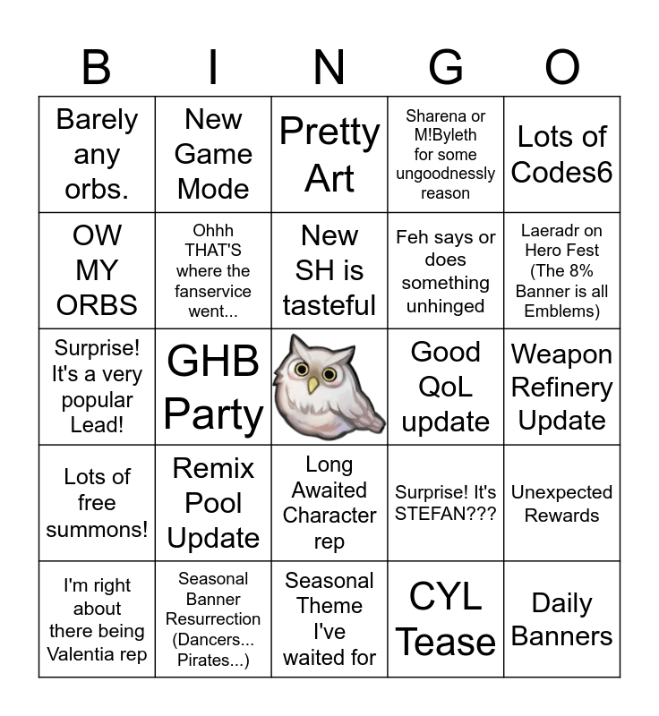 This bingo card has a free space and 24 words: Remix Pool Update, Seasonal Banner Resurrection (Dancers... Pirates...), New SH is tasteful, I'm right about there being Valentia rep, Lots of Codes6, Barely any orbs., OW MY ORBS, New Game Mode, Good QoL update, Long Awaited Character rep, Feh says or does something unhinged, Surprise! It's a very popular Lead!, Surprise! It's STEFAN???, Unexpected Rewards, Ohhh THAT'S where the fanservice went..., CYL Tease, Weapon Refinery Update, Pretty Art, Laeradr on Hero Fest (The 8% Banner is all Emblems), GHB Party, Daily Banners, Lots of free summons!, Sharena or M!Byleth for some ungoodnessly reason and Seasonal Theme I've waited for.