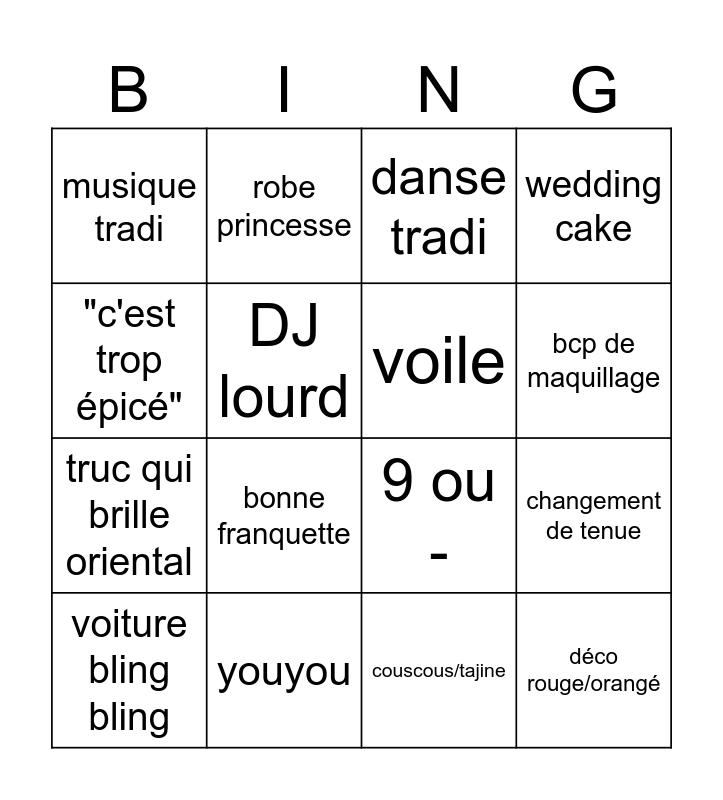 This bingo card has 16 words: youyou, changement de tenue, danse tradi, musique tradi, truc qui brille oriental, robe princesse, 9 ou -, couscous/tajine, "c'est trop épicé", DJ lourd, voiture bling bling, wedding cake, bonne franquette, bcp de maquillage, voile and déco rouge/orangé.