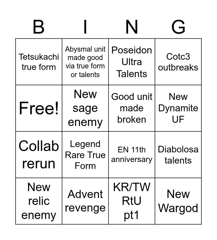 This bingo card has 16 words: Advent revenge, Diabolosa talents, Poseidon Ultra Talents, Tetsukachi true form, Collab rerun, Abysmal unit made good via true form or talents, EN 11th anniversary, KR/TW RtU pt1, Free!, New sage enemy, New relic enemy, Cotc3 outbreaks, Legend Rare True Form, New Dynamite UF, Good unit made broken and New Wargod.