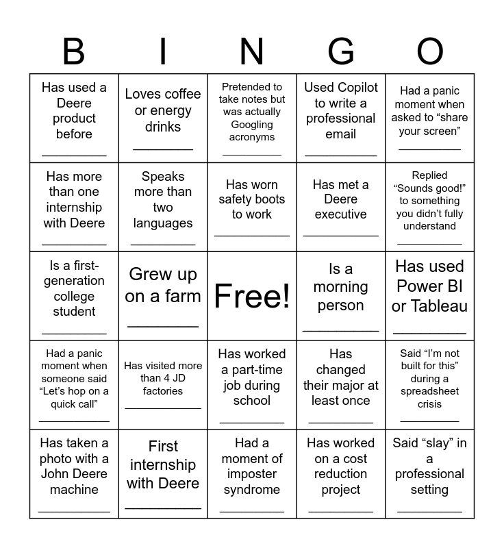 This bingo card has a free space and 24 words: Has visited more than 4 JD factories _____________, First internship with Deere _________, Has worn safety boots to work ___________, Has taken a photo with a John Deere machine __________, Had a panic moment when asked to “share your screen” __________, Has used a Deere product before _________, Has more than one internship with Deere _________, Loves coffee or energy drinks ________, Is a morning person _________, Has worked a part-time job during school _________, Has met a Deere executive ___________, Is a first-generation college student _________, Has changed their major at least once _________, Said “I’m not built for this” during a spreadsheet crisis __________, Speaks more than two languages _________, Has worked on a cost reduction project _________, Has used Power BI or Tableau ________, Pretended to take notes but was actually Googling acronyms __________, Replied “Sounds good!” to something you didn’t fully understand ___________, Grew up on a farm _______, Said “slay” in a professional setting _________, Had a panic moment when someone said “Let’s hop on a quick call” ____________, Used Copilot to write a professional email __________ and Had a moment of imposter syndrome _________.