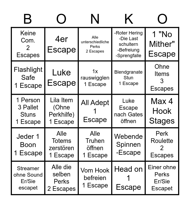 This bingo card has 25 words: Alle Totems zerstören 1 Escape, Vom Hook befreien 1 Escape, 1x rauswigglen 1 Escape, Streamer ohne Sound Er/Sie escapet, 1 "No Mither" Escape, Keine Com. 2 Escapes, Flashlight Safe 1 Escape, 4er Escape, Luke Escape nach Gates öffnen, Alle Truhen öffnen 1 Escape, Blendgranate Stun 1 Escape, 1 Person 3 Pallet Stuns 1 Escape, Webende Spinnen -Escape, Perk Roulette 2 Escapes, Luke Escape, Einer ohne Perks Er/Sie Escapet, Max 4 Hook Stages, Alle unterschiedliche Perks 2 Escapes, Ohne Items 3 Escapes, Lila Item (Ohne Perkhilfe) 1 Escape, All Adept 1 Escape, Alle die selben Perks 2 Escapes, Jeder 1 Boon 1 Escape, -Roter Hering -Die Last schultern -Befreiung -Sprengfalle and Head on 1 Escape.