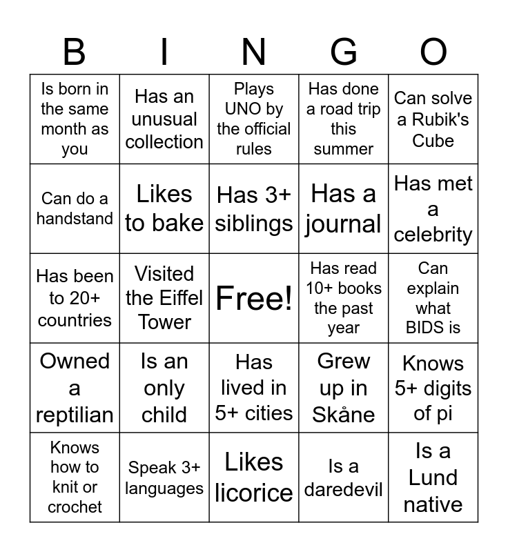 This bingo card has a free space and 24 words: Is an only child, Speak 3+ languages, Has 3+ siblings, Knows how to knit or crochet, Can solve a Rubik's Cube, Is born in the same month as you, Can do a handstand, Has an unusual collection, Has read 10+ books the past year, Has lived in 5+ cities, Has a journal, Has been to 20+ countries, Grew up in Skåne, Knows 5+ digits of pi, Likes to bake, Is a daredevil, Can explain what BIDS is, Plays UNO by the official rules, Has met a celebrity, Visited the Eiffel Tower, Is a Lund native, Owned a reptilian, Has done a road trip this summer and Likes licorice.