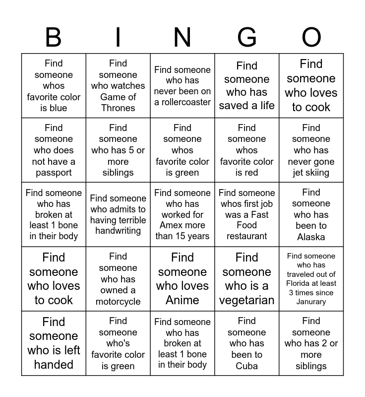 This bingo card has 50 words: Find someone who has worked for Amex less than 1 year, Find someone who has worked for Amex more than 15 years, Find someone who still shops at Costco, Find someone who has broken at least 1 bone in their body, Find someone who has owned a motorcycle, Find someone who played a varsity/college level sport, Find someone who watches Game of Thrones, Find someone who likes Cats better than Dogs, Find someone who does not have a passport, Find someone who has traveled to at least 4 countries, Find someone who has 5 or more siblings, Find someone who has saved a life, Find someone who has traveled out of Florida at least 3 times since Janurary, Find someone who is a vegetarian, Find someone who has worked less than 1 year at Amex, Find someone whos favorite color is blue, Find someone whos favorite color is green, Find someone whos first job was a Fast Food restaurant, Find someone who has never gone jet skiing, Find someone who loves to cook, Find someone who admits to having terrible handwriting, Find someone who has been to Cuba, Find someone whos favorite color is blue, Find someone whos favorite color is red, Find someone whos favorite color is white, Find someone who has 2 or more siblings, Find someone who has never gone jet skiing, Find someone who has traveled to at least 4 countries, Find someone who has never been on a rollercoaster, Find someone who loves Anime, Find someone who likes Cats better than Dogs, Find someone who does not have a passport, Find someone who watches Game of Thrones, Find someone who has never been to Disney, Find someone who's favorite color is green, Find someone who has never gone jet skiing, Find someone who loves K-Pop, Find someone who doesn't like ice cream, Find someone who is afraid of heights, Find someone who has been to Alaska, Find someone that is allergic to avocado, Find someone that speaks more than 2 languages, Find someone who rides horses, Find someone who has never flown on a plane, Find someone who is left handed, Find someone who has broken at least 1 bone in their body, Find someone who has been to more than 10 concerts, Find someone whos birthday is on a holiday, Find someone who loves to cook and Find someone who likes to snorkel.