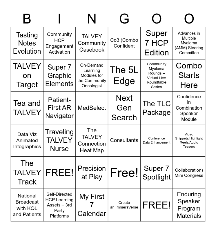 This bingo card has 36 words: Free!, Precision at Play, Create an ImmersVerse, TALVEY on Target, Data Viz Animated Infographics, Next Gen Search, Super 7 Graphic Elements, My First 7 Calendar, Super 7 HCP Edition, Super 7 Spotlight, Combo Starts Here, Co3 (Combo Confident, Collaboration) Mini Congress, Patient-First AR Navigator, The 5L Edge, Tasting Notes Evolution, The TALVEY Track, The TLC Package, Tea and TALVEY, TALVEY Community Casebook, MedSelect, Traveling TALVEY Nurse, Consultants, The TALVEY Connection Heat Map, Conference Data Enhancement, Community HCP Engagement Activation, Community Myeloma Rounds – Virtual Live Roundtable Series, Self-Directed HCP Learning Assets – 3rd Party Platforms, On-Demand Learning Modules for the Community Oncologist, Advances in Multiple Myeloma (AMM) Steering Committee, Enduring Speaker Program Materials, National Broadcast with KOL and Patients, Video Snippets/Highlight Reels/Audio Teasers, Confidence in Combination Speaker Module, FREE! and FREE!.