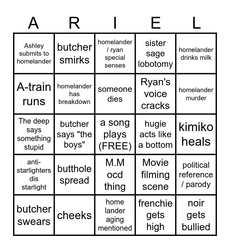 This bingo card has a free space and 24 words: butthole spread, cheeks, someone dies, butcher swears, homelander drinks milk, Ashley submits to homelander, A-train runs, butcher smirks, hugie acts like a bottom, M.M ocd thing, Ryan's voice cracks, The deep says something stupid, Movie filming scene, political reference / parody, homelander has breakdown, frenchie gets high, kimiko heals, homelander / ryan special senses, homelander murder, butcher says "the boys", noir gets bullied, anti-starlighters dis starlight, sister sage lobotomy and home lander aging mentioned.