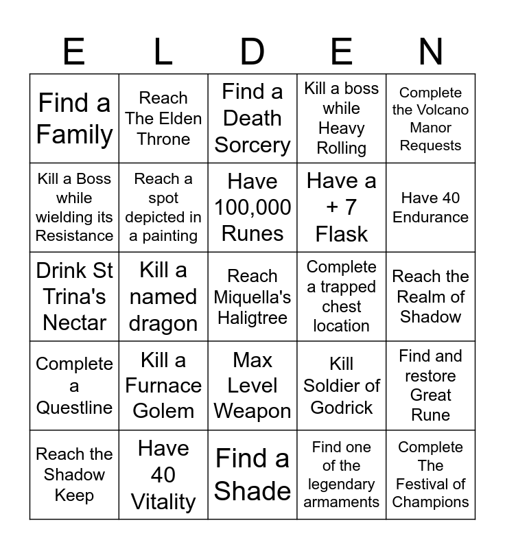 This bingo card has 25 words: Kill a Furnace Golem, Find a Shade, Have 100,000 Runes, Reach the Shadow Keep, Complete the Volcano Manor Requests, Find a Family, Kill a Boss while wielding its Resistance, Reach The Elden Throne, Complete a trapped chest location, Max Level Weapon, Have a + 7 Flask, Drink St Trina's Nectar, Kill Soldier of Godrick, Find and restore Great Rune, Reach a spot depicted in a painting, Complete The Festival of Champions, Reach the Realm of Shadow, Find a Death Sorcery, Have 40 Endurance, Kill a named dragon, Reach Miquella's Haligtree, Have 40 Vitality, Complete a Questline, Kill a boss while Heavy Rolling and Find one of the legendary armaments.