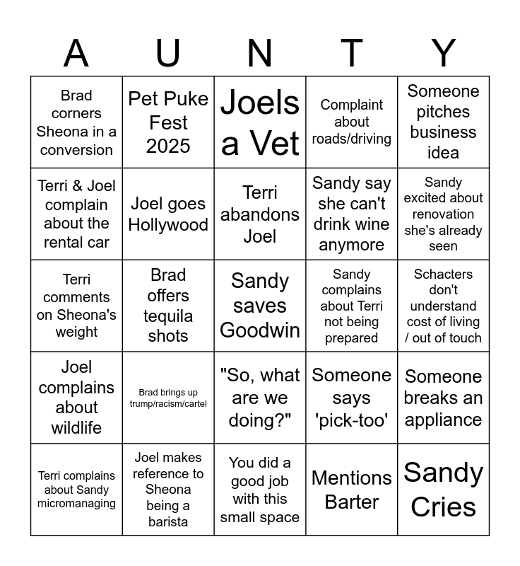 This bingo card has 25 words: Brad brings up trump/racism/cartel, You did a good job with this small space, Terri abandons Joel, Terri complains about Sandy micromanaging, Someone pitches business idea, Brad corners Sheona in a conversion, Terri & Joel complain about the rental car, Pet Puke Fest 2025, Sandy complains about Terri not being prepared, "So, what are we doing?", Sandy say she can't drink wine anymore, Terri comments on Sheona's weight, Someone says 'pick-too', Someone breaks an appliance, Joel goes Hollywood, Sandy Cries, Schacters don't understand cost of living / out of touch, Joels a Vet, Sandy excited about renovation she's already seen, Brad offers tequila shots, Sandy saves Goodwin, Joel makes reference to Sheona being a barista, Joel complains about wildlife, Complaint about roads/driving and Mentions Barter.