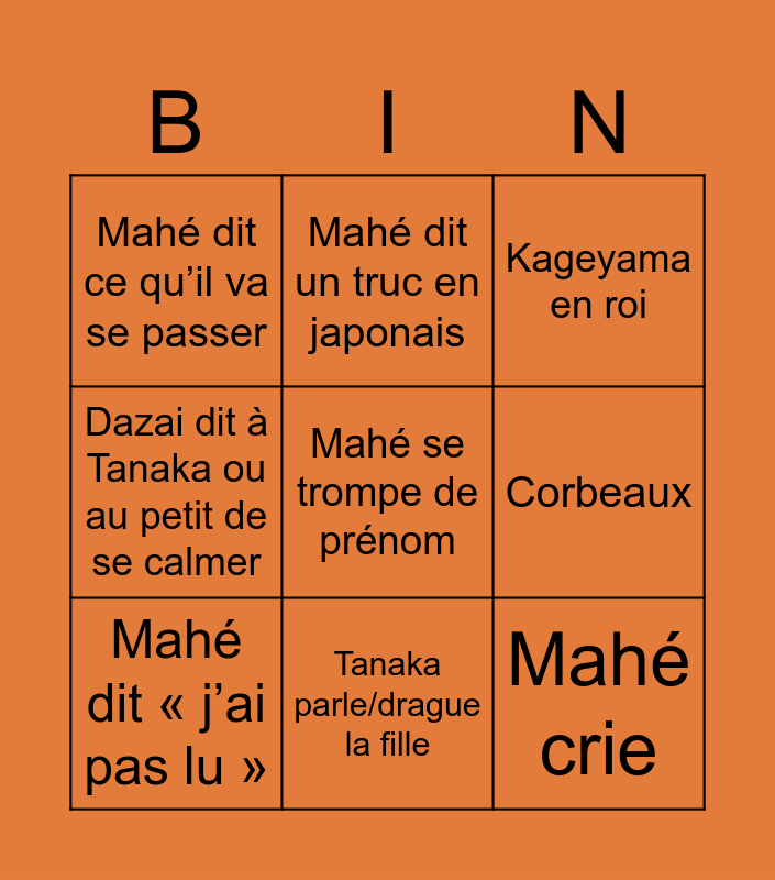 This bingo card has a free space and 8 words: Corbeaux, Kageyama en roi, Mahé dit un truc en japonais, Mahé dit « j’ai pas lu », Mahé dit ce qu’il va se passer, Mahé crie, Dazai dit à Tanaka ou au petit de se calmer and Tanaka parle/drague la fille.