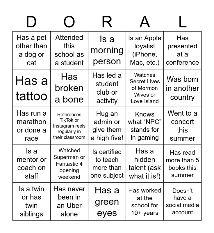 This bingo card has a free space and 41 words: Has met a celebrity, Has run a marathon or done a race, Can do a cartwheel, Has broken a bone, Has never been in an Uber alone, Is certified to teach more than one subject, Has led a student club or activity, Has taught abroad, Has presented at a conference, Is a mentor or coach on staff, References TikTok or Instagram reels regularly in their classroom, Is an Apple loyalist (iPhone, Mac, etc.), Doesn’t have a social media account, Went to a concert this summer, Knows what “NPC” stands for in gaming, Watched Superman or Fantastic 4 opening weekend, Loves pineapple on pizza, Has a pet other than a dog or cat, Prefers tea over coffee, Is a morning person, Has read more than 5 books this summer, Prefers beach over mountains, Has a green eyes, Watches Secret Lives of Mormon Wives or Love Island, Listens to Christmas Music all year, Can recite movie lines from memory, Has worked at the school for 10+ years, Speaks more than two languages, Was born in another country, Has more than three siblings, Was not a teacher in their first career, Attended this school as a student, Is a twin or has twin siblings, Played a college sport, Has a hidden talent (ask what it is!), Has a tattoo, Has skydived, bungee jumped, or parasailed, Has a master's degree not in education, Plays a musical instrument proficiently, Grows their own fruits or vegetables and Knows how to code or build websites.