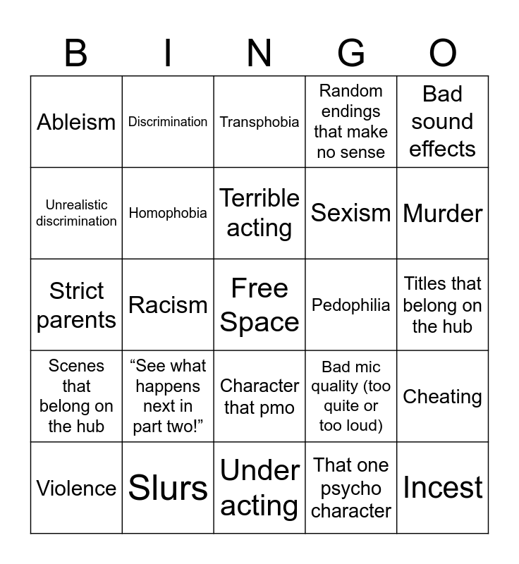 This bingo card has a free space and 24 words: “See what happens next in part two!”, Slurs, Terrible acting, Violence, Bad sound effects, Ableism, Unrealistic discrimination, Discrimination, Pedophilia, Character that pmo, Sexism, Strict parents, Bad mic quality (too quite or too loud), Cheating, Homophobia, That one psycho character, Titles that belong on the hub, Transphobia, Murder, Racism, Incest, Scenes that belong on the hub, Random endings that make no sense and Under acting.